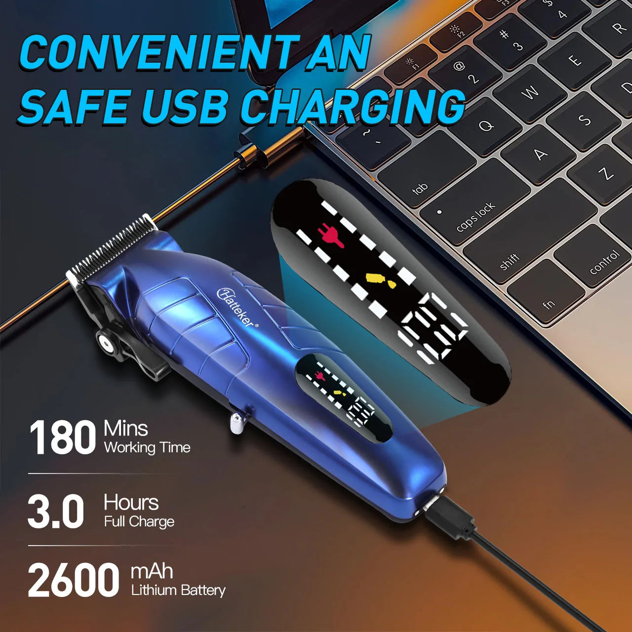 Tondeuse à cheveux électrique pour homme HATTEKER HT-6036 bleue, sans fil et rechargeable par USB